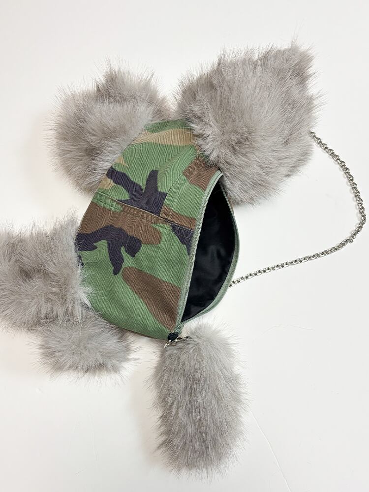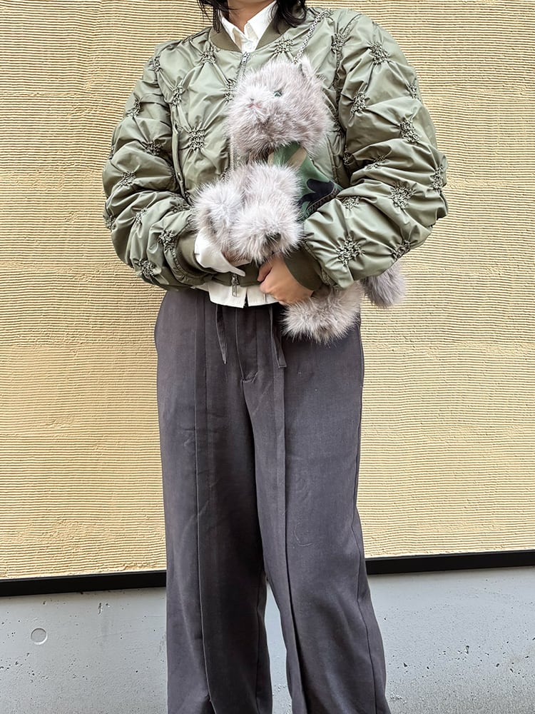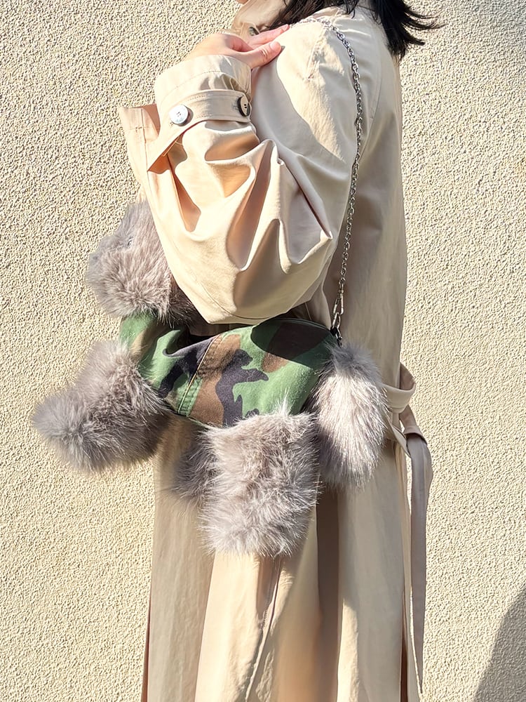 お腹部分には、スタイリングに自然に馴染むヴィンテージのミリタリー生地をリメイクして使用しています。